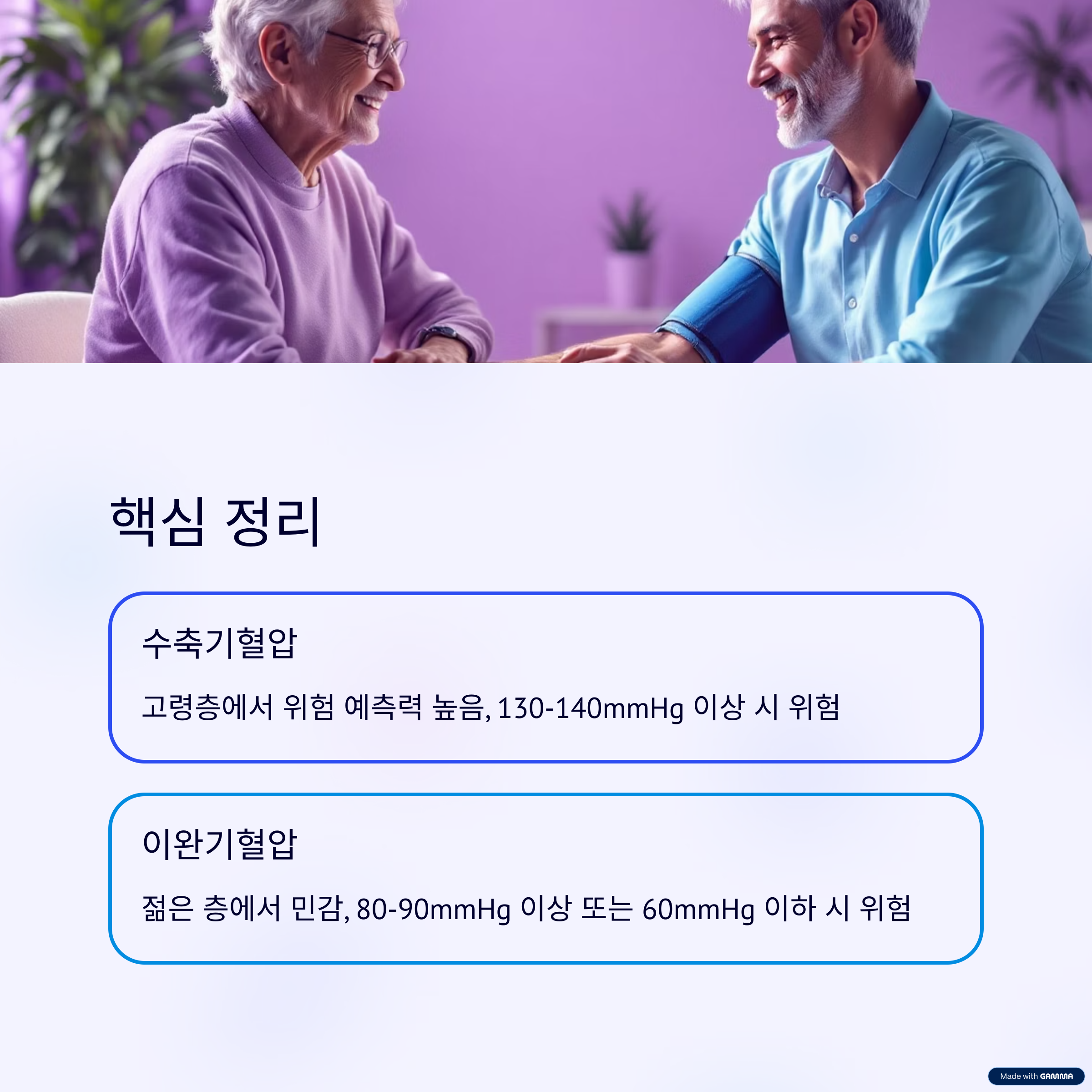 | 고령자 | 수축기혈압 + 이완기 저하 | 이완기 너무 낮을 경우 심장·신장 합병증 위험 상승 |