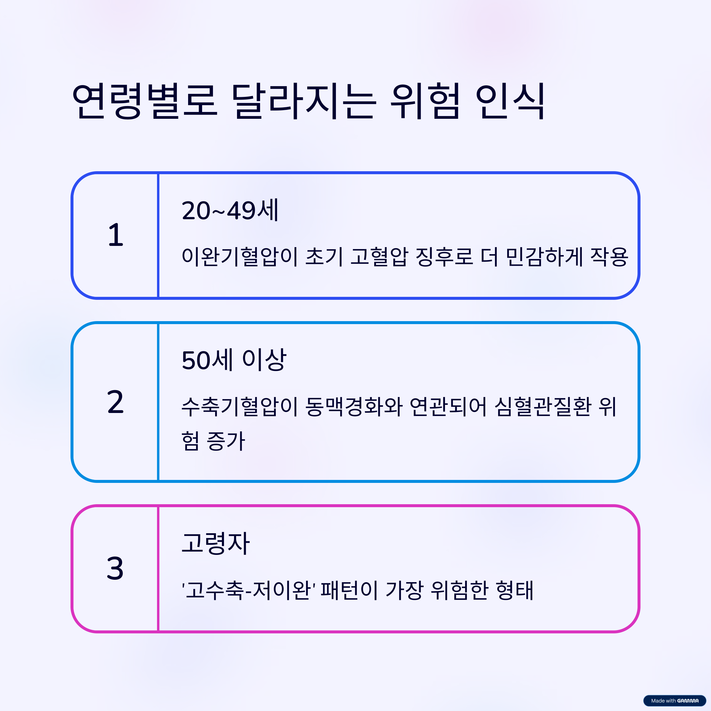 | 20~49세 | 이완기혈압 | 초기 고혈압 징후로 더 민감하게 작용 |