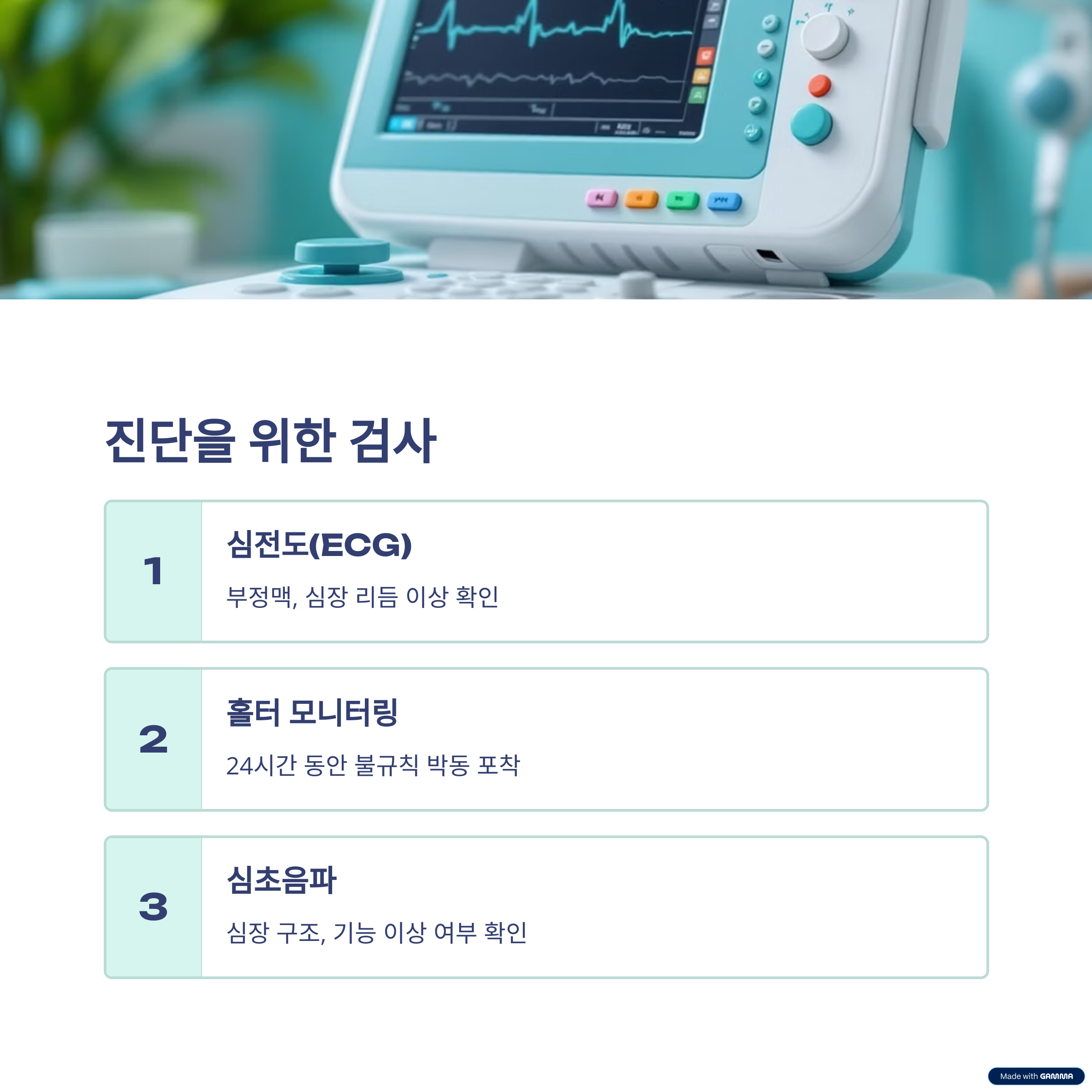 | 진단 방법 | 심전도, 홀터, 초음파, 혈액검사 등 종합적 검사 필요 |