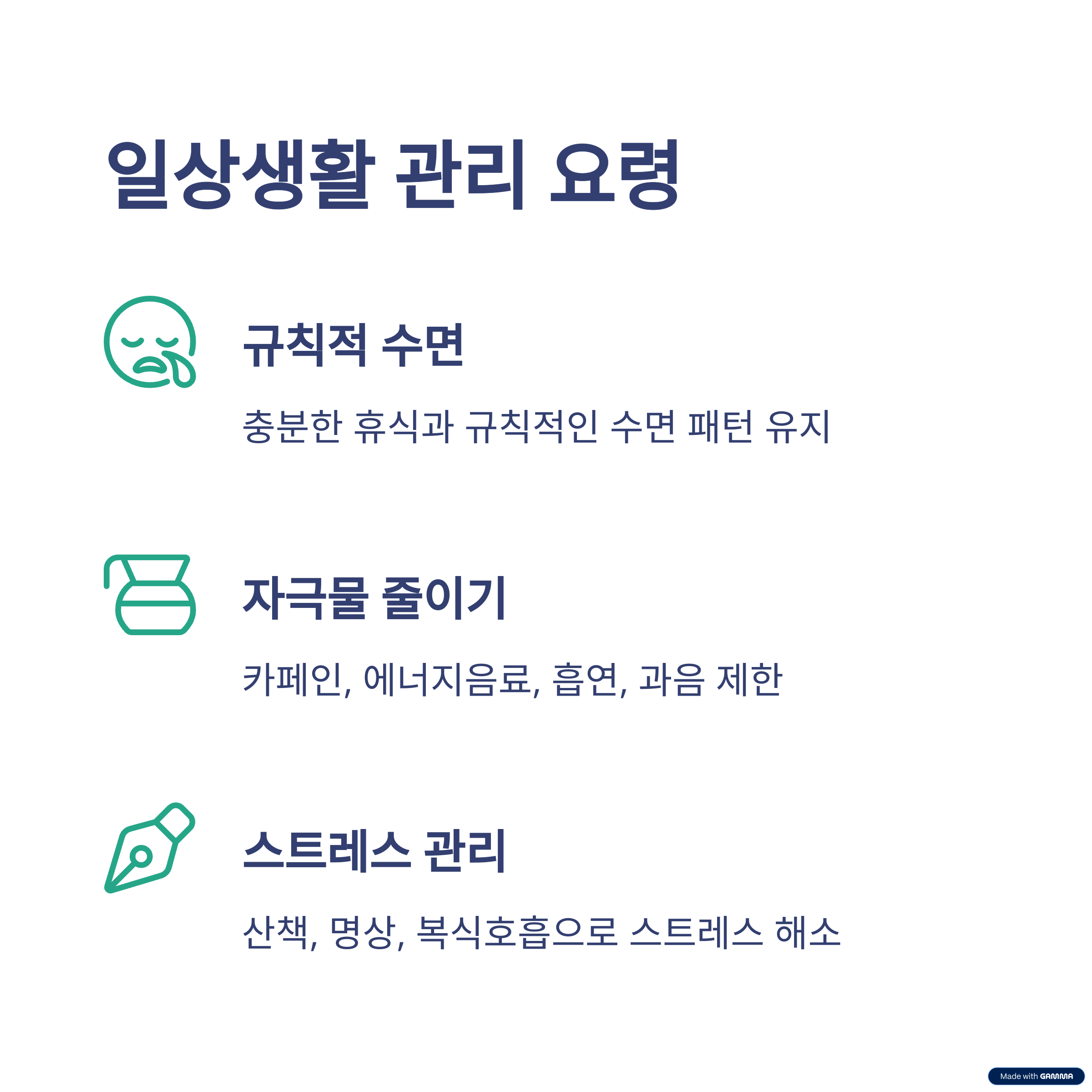 - 스트레스 해소법 실천 (산책, 명상, 복식호흡 등)